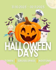 Vom 31.10. bis 02.11.2025 finden unsere Halloween Days statt. Freut euch auf ein toll geschmücktes Spielzelt, Süßigkeiten sowie familienfreundlichen Halloweenspaß! Es gilt der einheitliche Tarif von 10€/Person unabhängig vom Alter der Kinder und Erwachsenen. An diesem Tag gibt es keine Familientickets!
